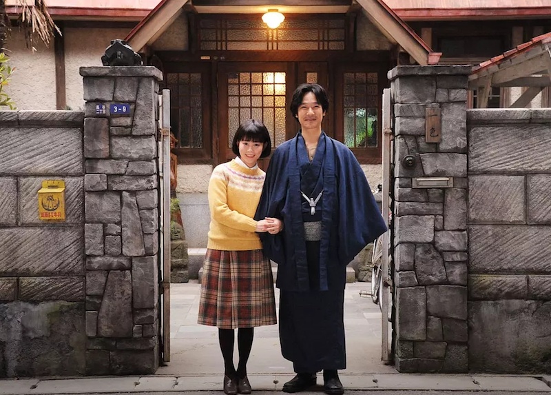 photos: Newlyweds Akiko (Mitsuki Takahata) and Masakazu Isshiki (Masato Sakai) stand in front of their home, in the film Destiny: The Tale of Kamakura. (She looks a bit young for him, no? There’s an explanation for that!)