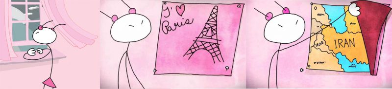 Language lesson: Opi often calls Teta crazy, in an affectionate way. At the beginning of the film, Tara Hakim tells us that the Arabic word for crazy is majnūn ( مَجْنون ). The Arabic word for bougainvillea sounds very similar and the couple’s garden is full of them. The flowers appear often in the film.