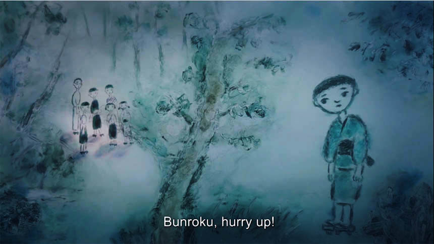 The story begins the way a low-key horror film might. A young boy named Bunroku narrates the story. Under a bright moon, he was walking to a night festival with his friends, but he couldn’t keep up with them because he was wearing his mother’s clogs. (Not the right size, I guess. What happened to his own shoes? Too small? They broke?)