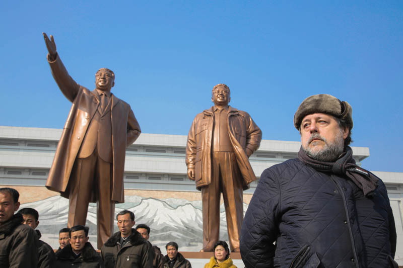 Documentary filmmaker Vitaly Manksy in in Pyongyang, North Korea, in 2014. Mansky is standing in front of one of the many monuments to North Korea’s founder, Kim Il-Sung, and his son, Kim Jong-Il.