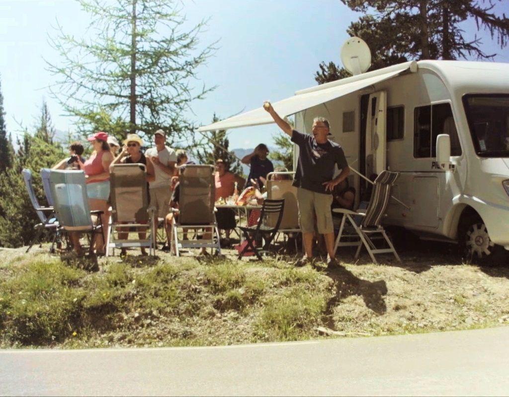 The fans are a relaxed, friendly, funny bunch and they pass the days before the Tour arrives with walks, sunbathing, playing cards, reading, chatting, cuddling small dogs, and eating. One man cycles uphill to a scenic restaurant to have a birthday meal. We laugh with them, not at them, as they wonder if it is too early for an aperitif, and struggle to pick up a TV signal, so they can follow the race as it heads their way.